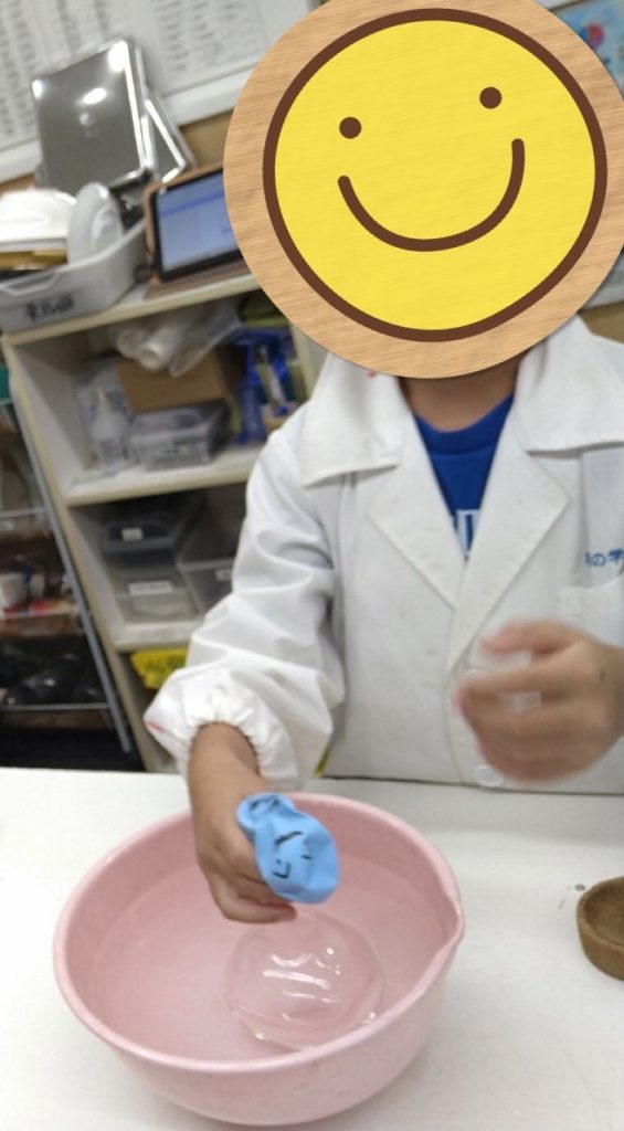 ↑洗面器のお湯でフラスコをあたためると、風船が膨らんでくる