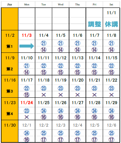 10/28(火)~11/3(祝月)までは調整休講でお休みです。